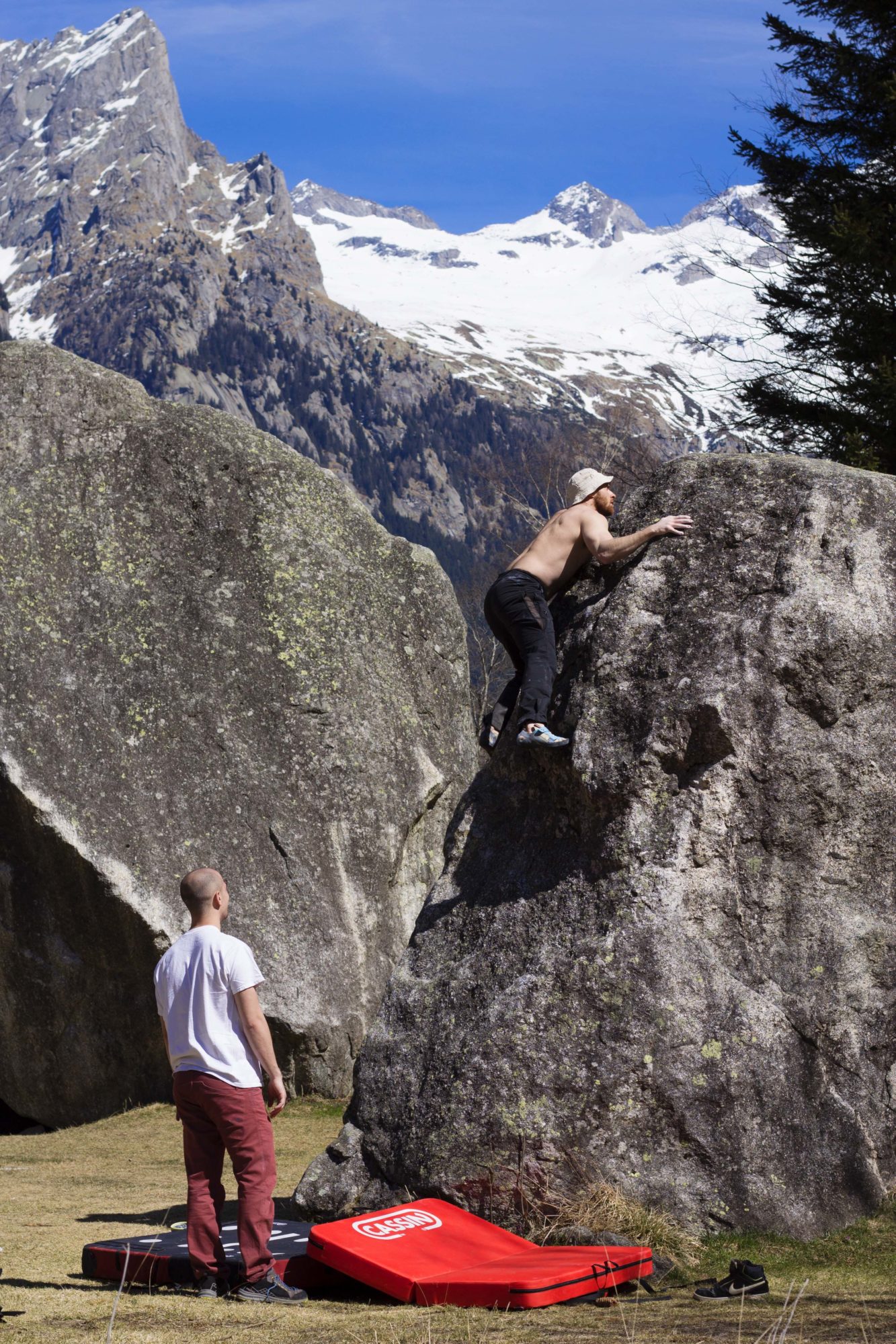Praticare l'arrampicata in stile boudering significa avventurarsi ai limiti delle proprie capacità e per evitare una brutta caduta è fondamentale mantenere sempre la concentrazione ed i nervi saldi, soprattutto quando ci si avvicina alla fine del blocco, ma è altrettanto importante avere sempre il sostegno di un amico. Val di Mello, Sondrio, 30/03/2019