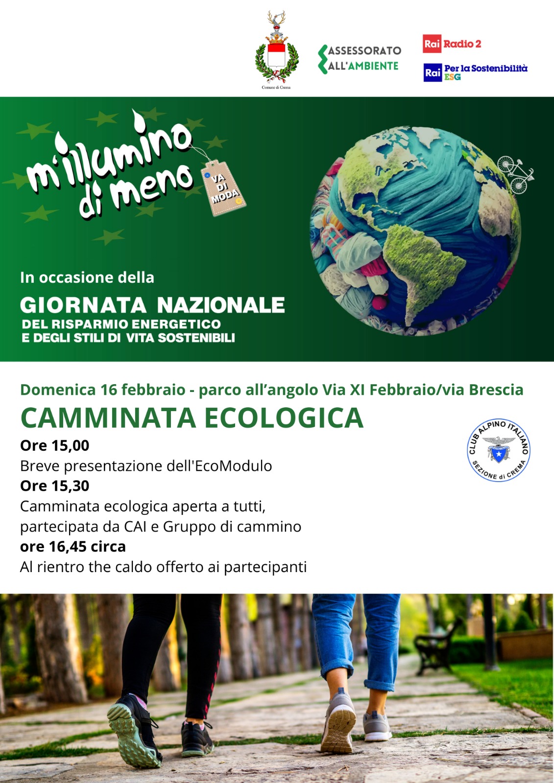 CAMMINATA ECOLOGICA: M’ILLUMINO DI MENO 7 Febbraio 2025 Domenica 16 Febbraio 2025 si terrà una camminata ecologica, dove parteciperà anche il CAI di Crema. 3,6 Km percorso facile di tipo T/E CategoryNews