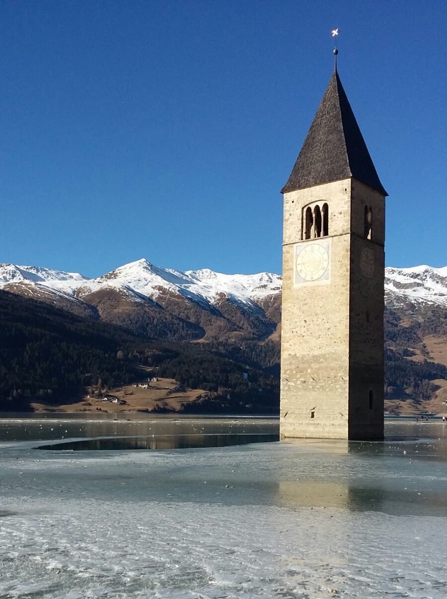 Lago di Resia: campanile sommerso a Curon/Val Venosta
