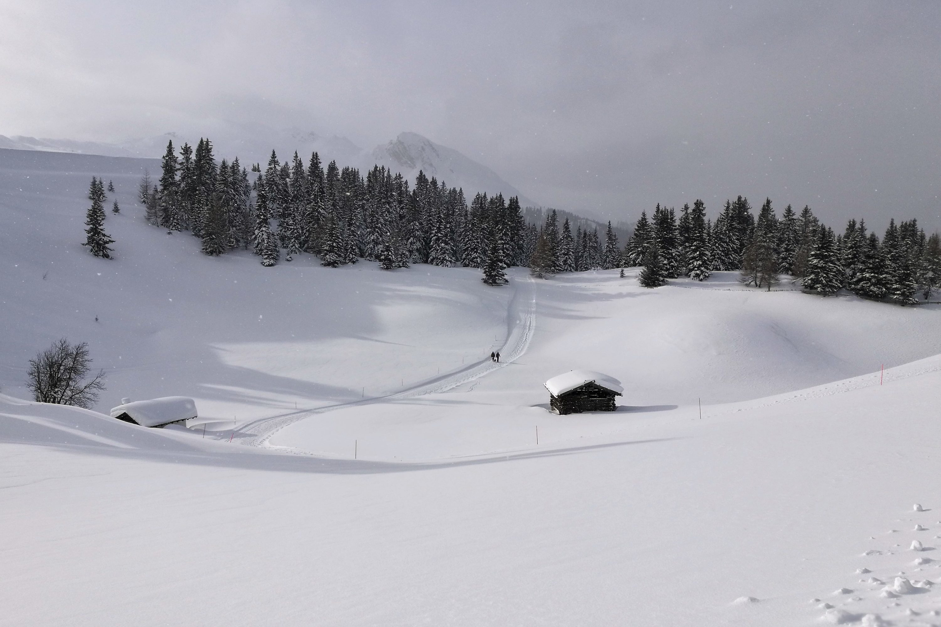 Comprensorio Racines - Giovo. Una coppia cammina in un paesaggio fiabesco dove la quiete e il silenzio dominano la scena.