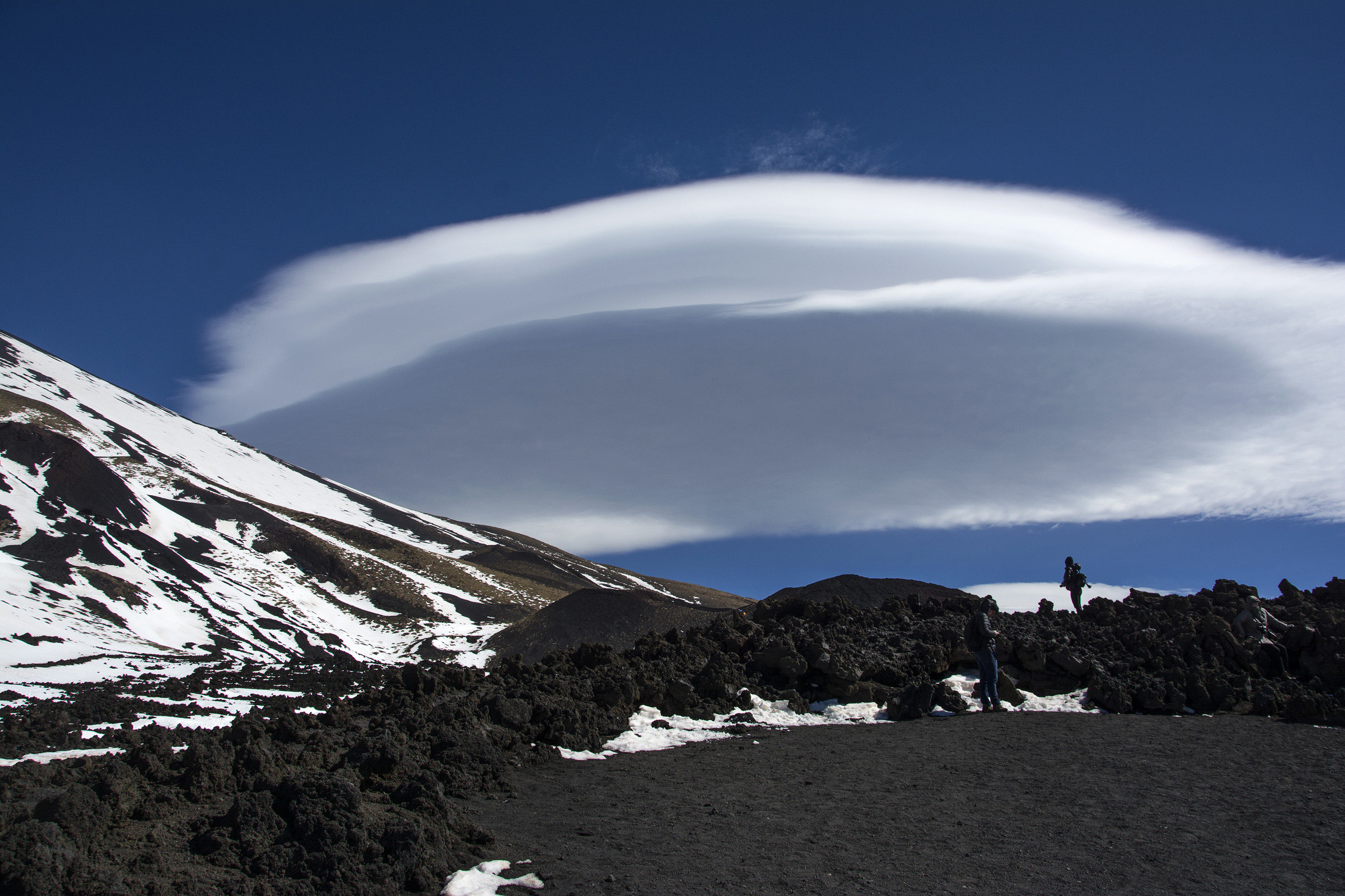 Sicilia: su un cratere dell'Etna per ammirare il paesaggio in una splendida giornata di sole con la nuvola formata dal pennacchio di fumo che esci dal cratere più alto.
