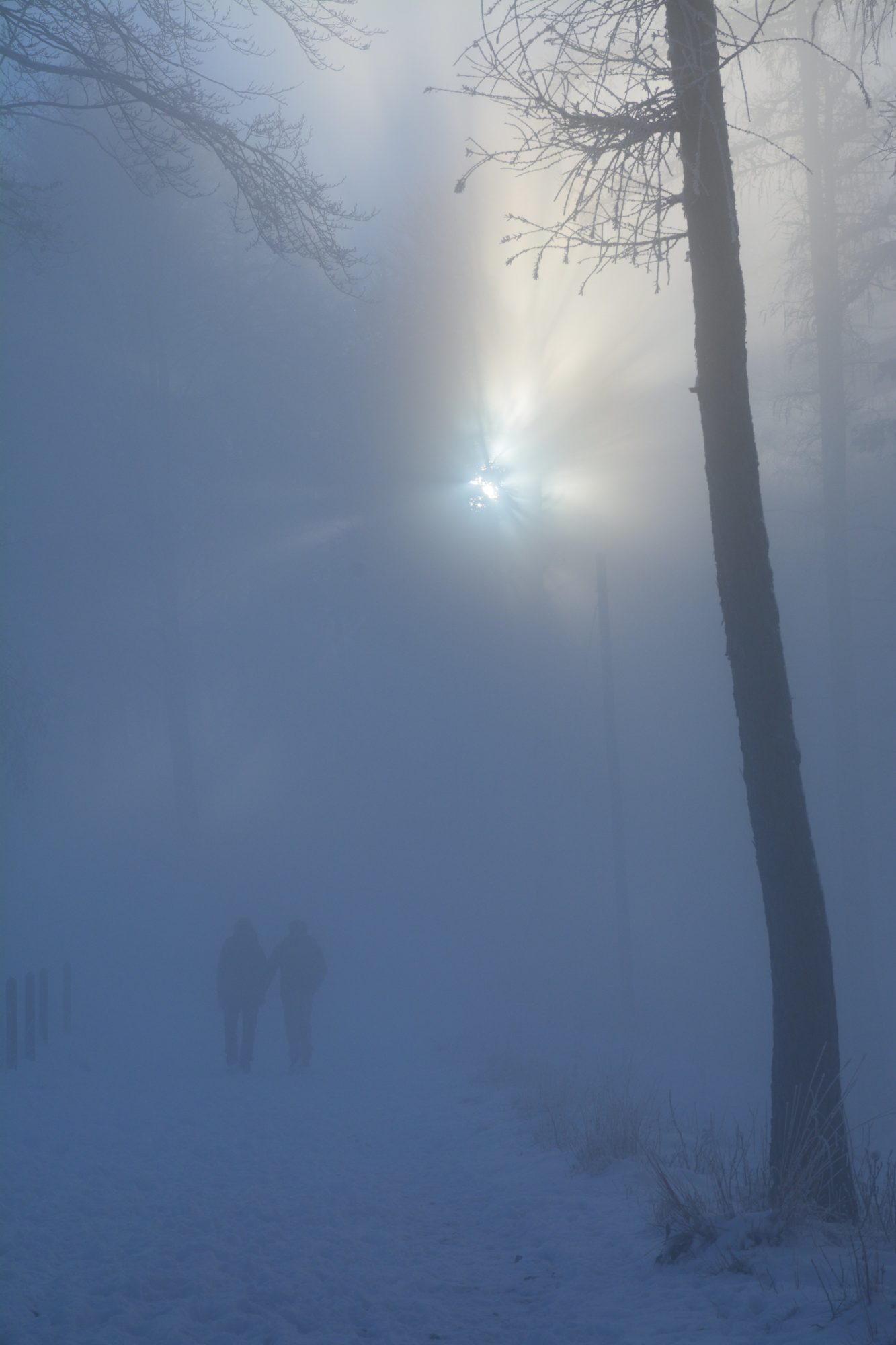 Dopo una nevicata, nel bosco invaso dalla nebbia, cercando uno spiraglio di luce, un riflesso dell'anima.