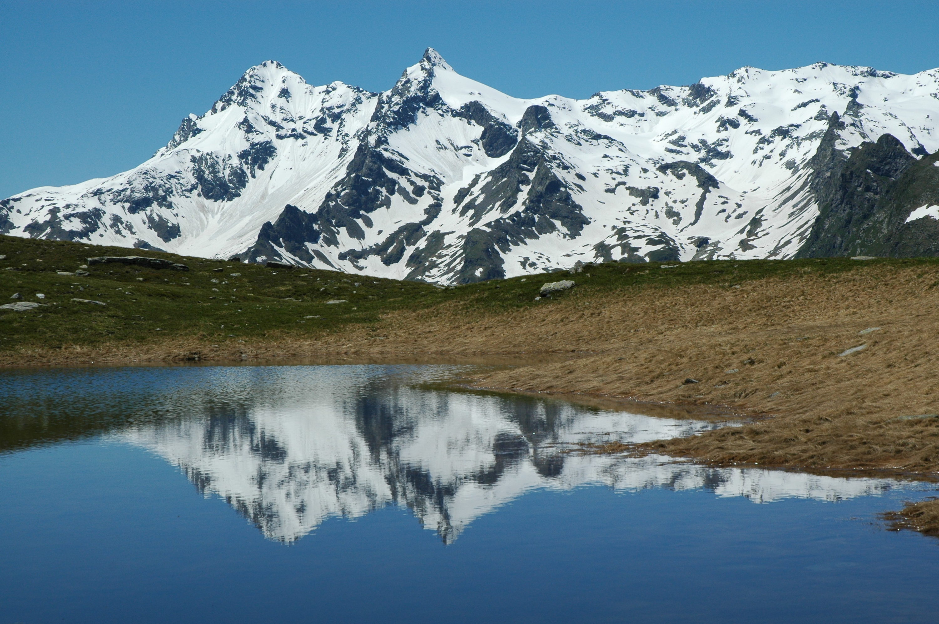 Anche in un piccolo cuore può vivere un grande amore. Le cime dell'alta Valle Spluga si specchiano in un piccolissimo laghetto fra i dossi dell'Alpe Emet.