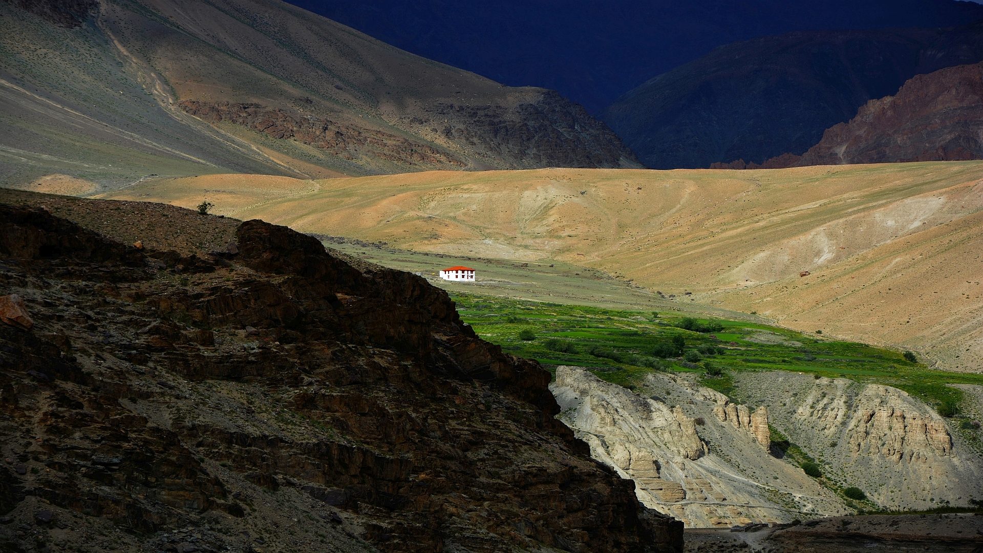 Ladhak , il tempo è stato inclemente , ora uno squarcio di sole rimbalza sul bianco candore di di una costruzione laggiù tra i monti scuri...tra poco viverà di nuovo.