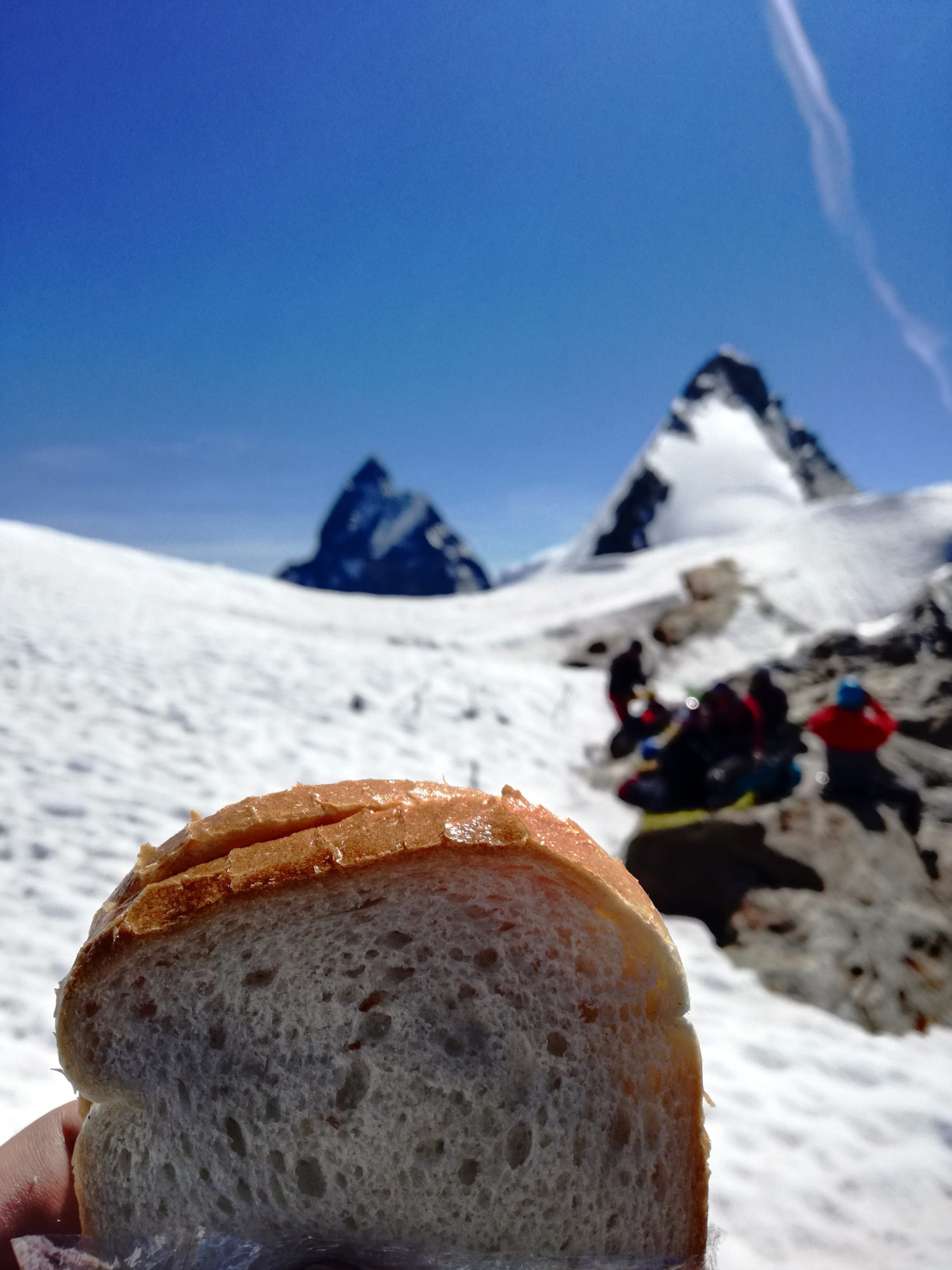 Pranzo a 3800m s.l.m. in prossimità della vetta della Tête de Valpelline. Sullo sfondo la Dent d'Hérens e il Cervino.