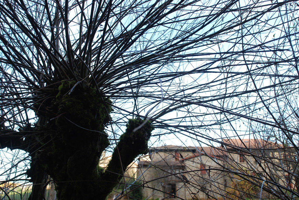Ho fotografato un casolare di Bardi attraverso i rami di una pianta in una giornata d'estate
