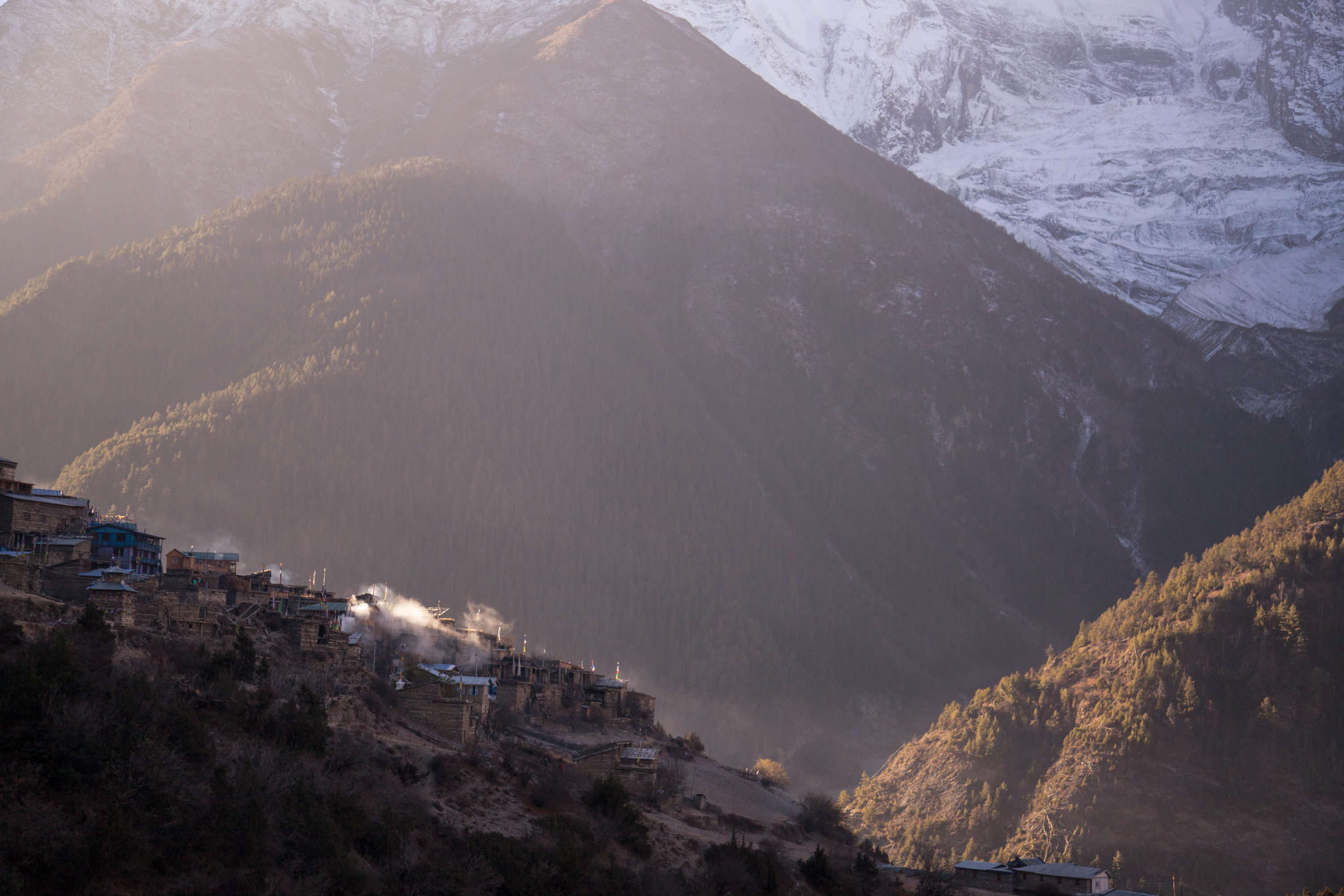 In questa foto si può vedere il villaggio di Upper Pisang alle prime luci dell'alba, ricordo il forte desiderio che avevo di poter entrare in quella fascia di luce per poter scaldarmi.