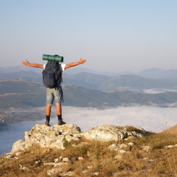 escursionista in montagna spalanca le braccia davanti la maestosità del paesaggio
