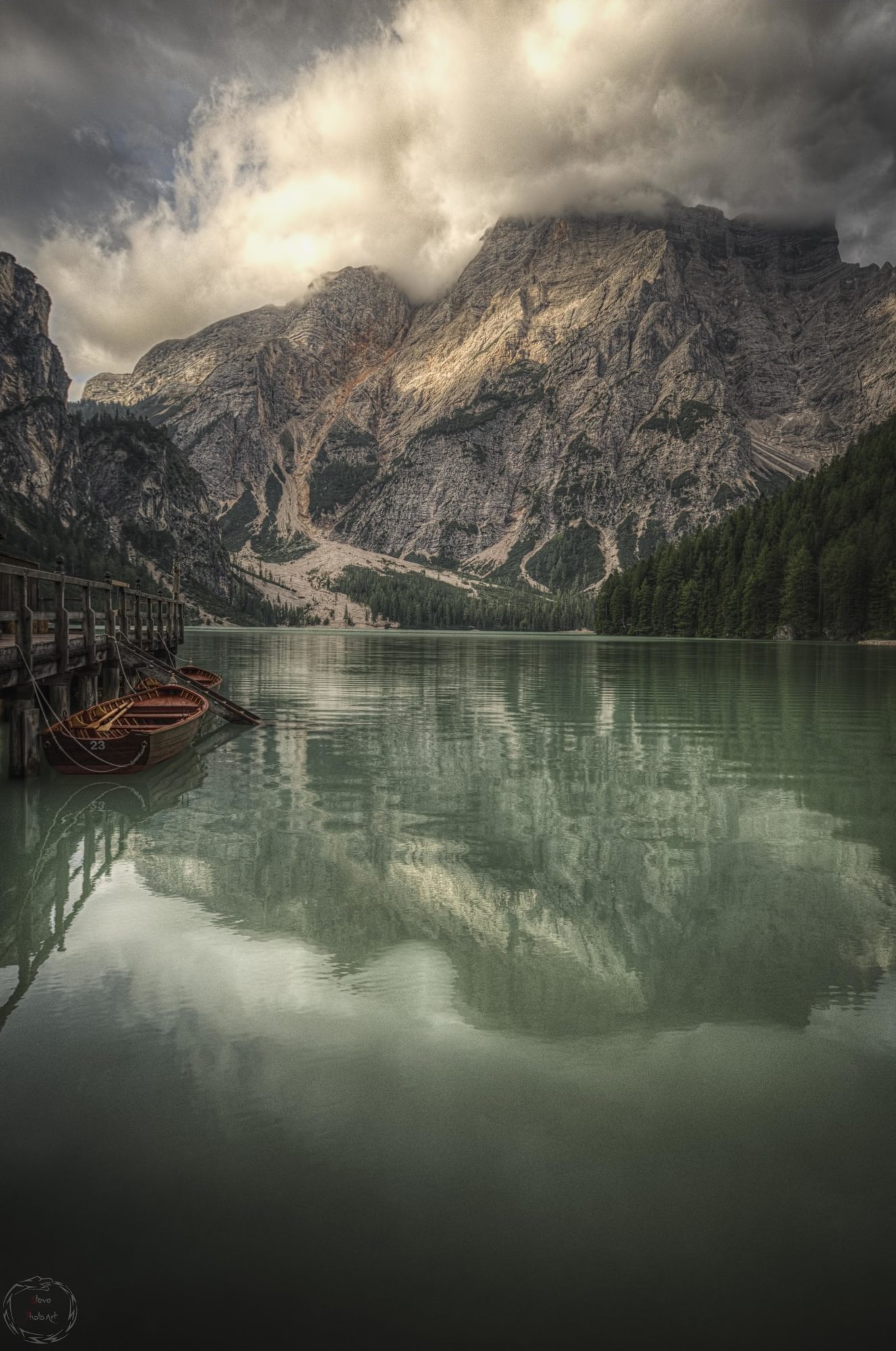 La foto ritrae il lago di Braies nelle Dolomiti alle prime luci dell'alba già parzialmente obnubilate dall'arrivo di nuvole temporalesche, ho voluto dare rilievo nella composizione alla frana centrale, avvenuta 3 giorni prima del mio arrivo che non mi ha permesso di proseguire sull'altavia numero 1, costringendomi a piantare la tenda in un bosco limitrofo al lago, ma permettendomi(colpa anche il gran freddo) di svegliarmi e catturare questo istante.