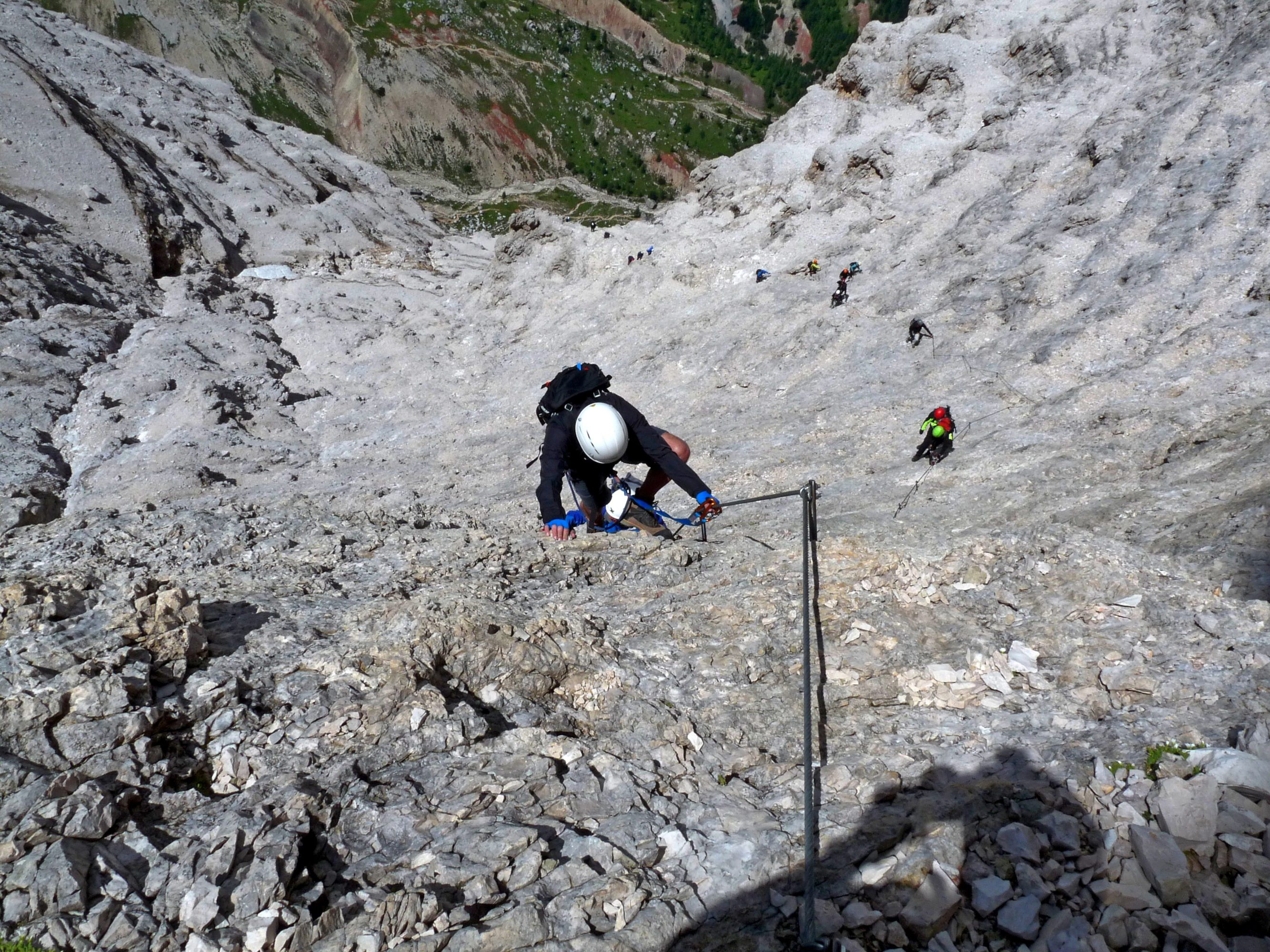 Un gruppo di escursionisti risalgono la parete della Tofana di Rozes lungo la via ferrata Lipella
