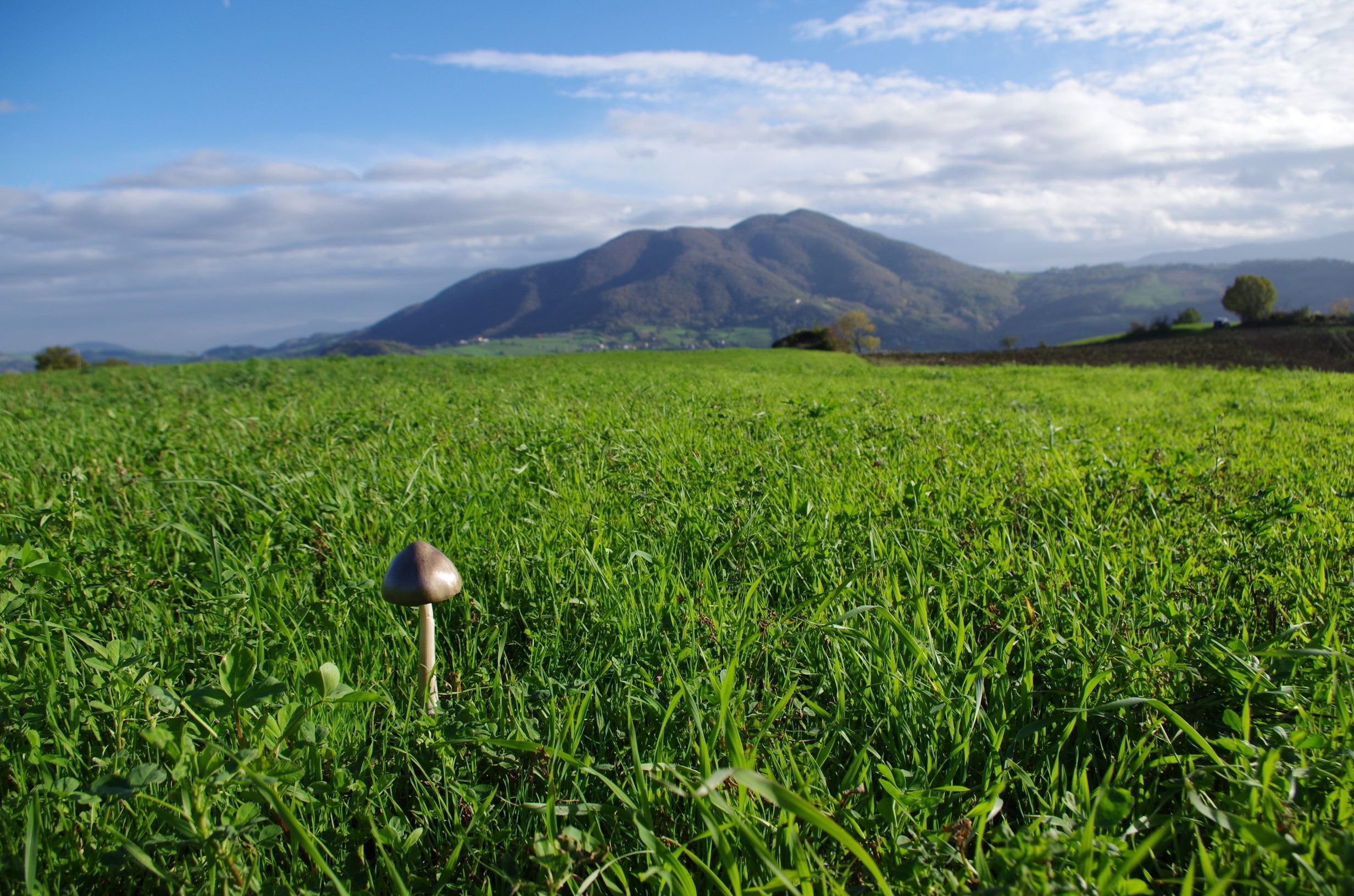 Appennino Parmense, il monte là in fondo è il Santa Cristina, al di qui della valle c'è un grande prato stranamente in piano in mezzo a tanti prati scoscesi, camminando su quel prato ho notato quell'unico funghetto che mi ha ispirato lo scatto, in fondo il vero protagonista della scena è proprio lui.