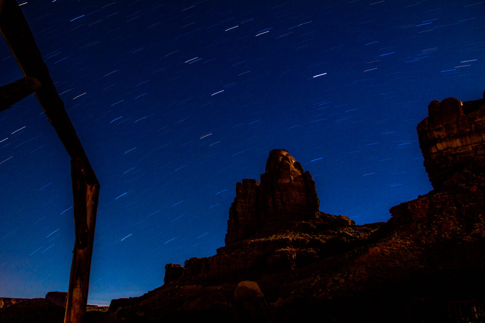 Foto scattata a Monument Valley con un tempo di esposizione di 8 minuti. La trave di legno è stata inclusa nella foto volutamente per dare una percezione di vicinanza dei monti di fronte a noi.