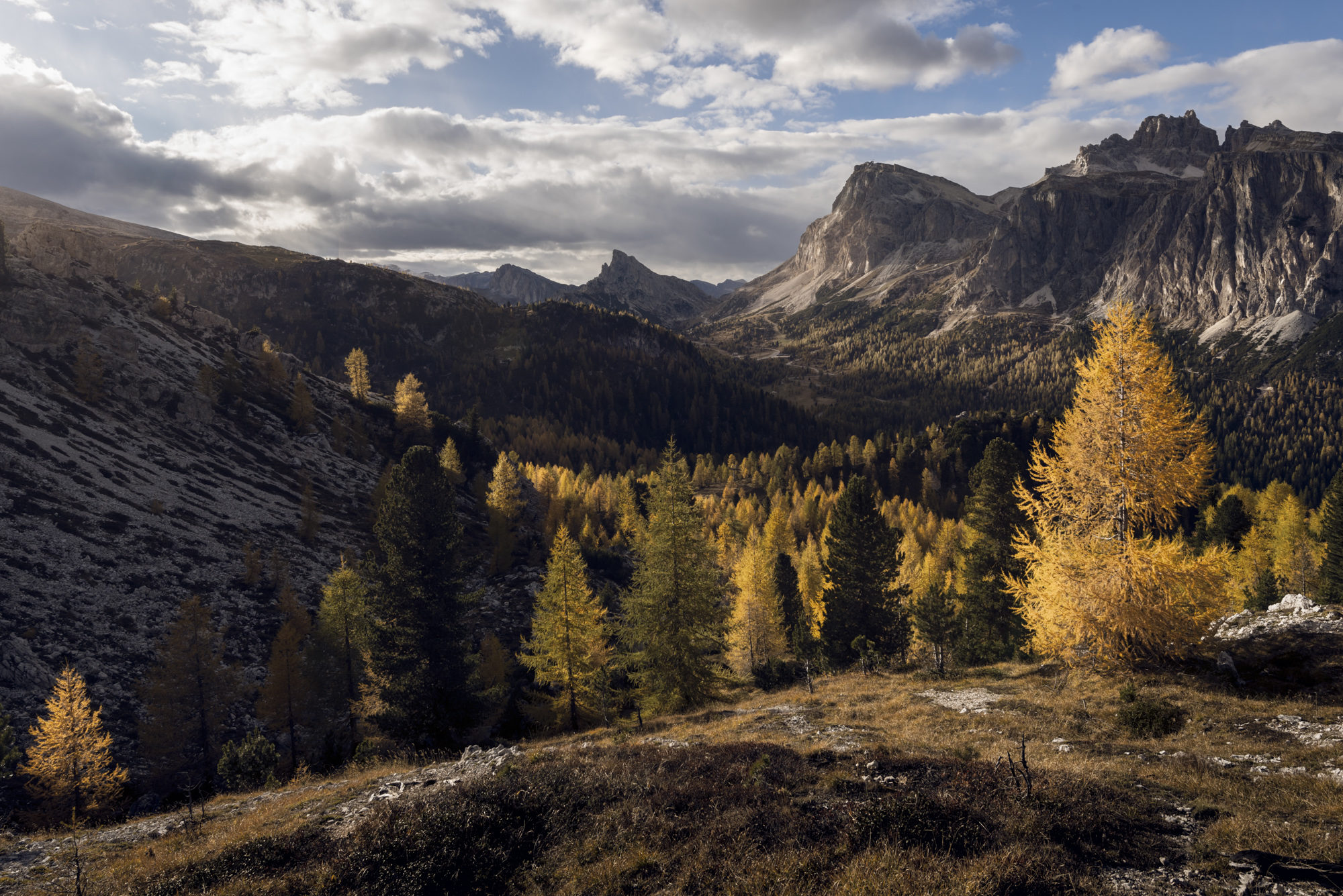 Aspettando il tramonto dalle 5 torri di Cortina lo sguardo si estende sulla valle e il passo Falzarego, dove il sole che filtra tra le nuvole accende i colori autunnali