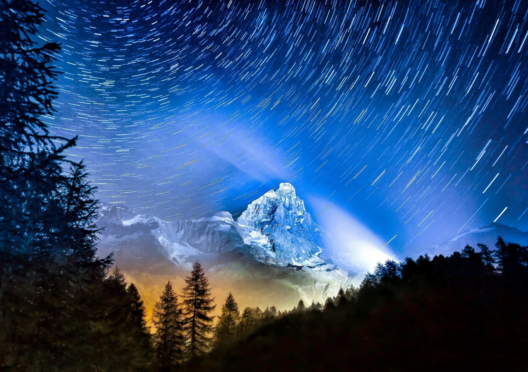 Foto del Cervino dal lago Blu, durante i festeggiamenti dei 150 (anno 2015) anni dalla prima ascensione al Cervino, con la illuminazione artificiale dello stesso