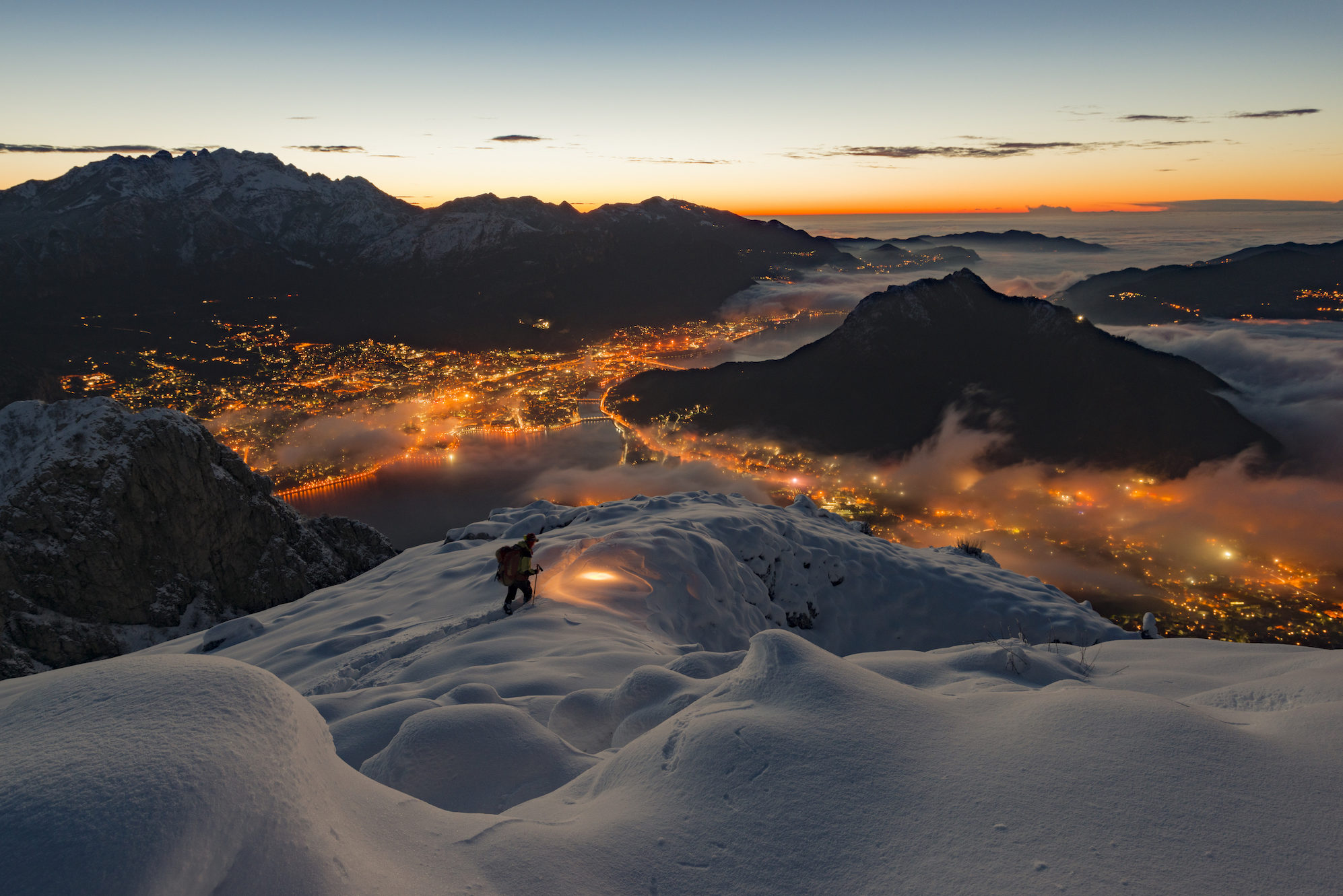 Arrivo all'alba sulla vetta del Monte Moregallo, splendido belvedere a picco sulla città di Lecco.