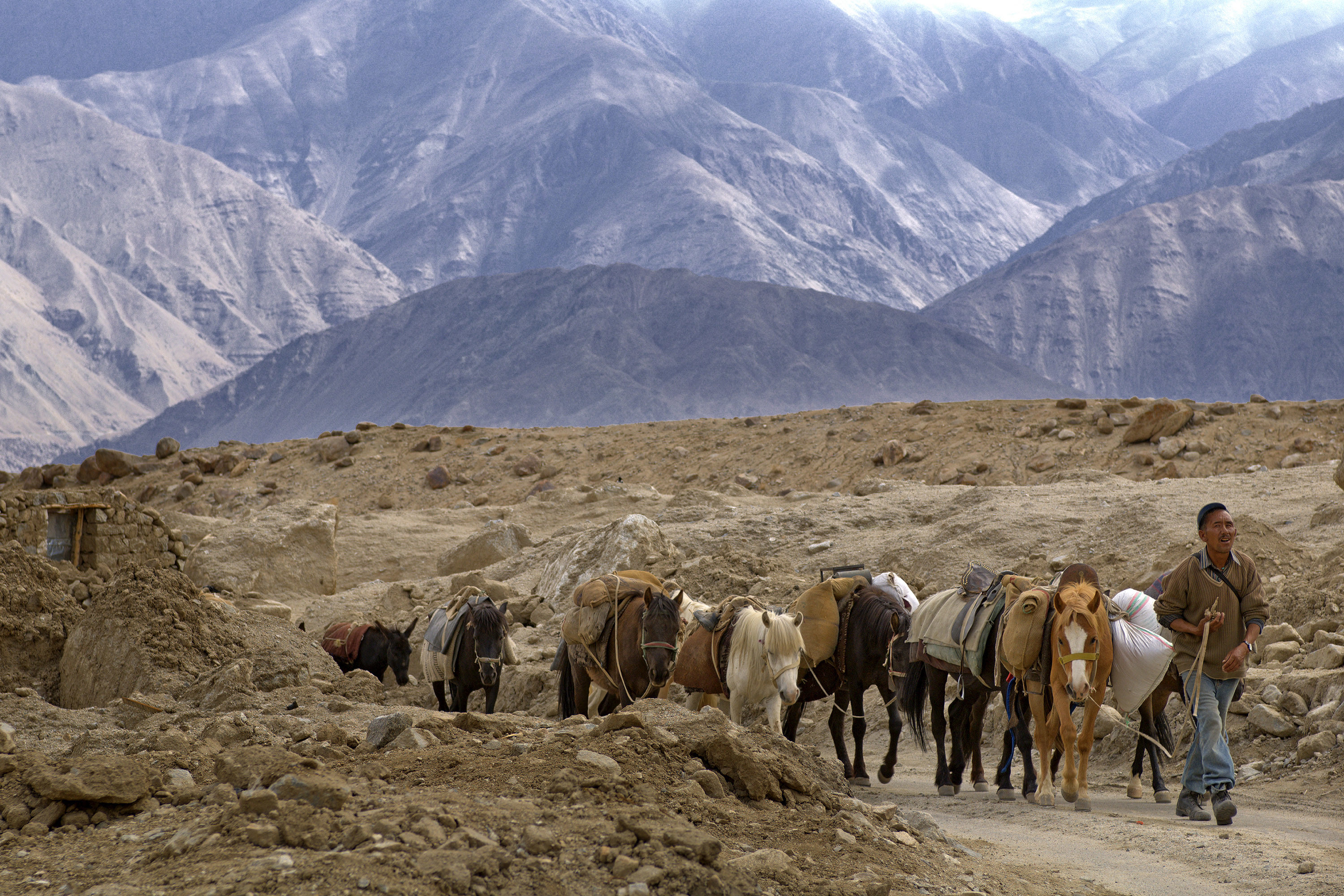 Un pastore con il suo gregge transita nelle alte vette del Ladak (india)