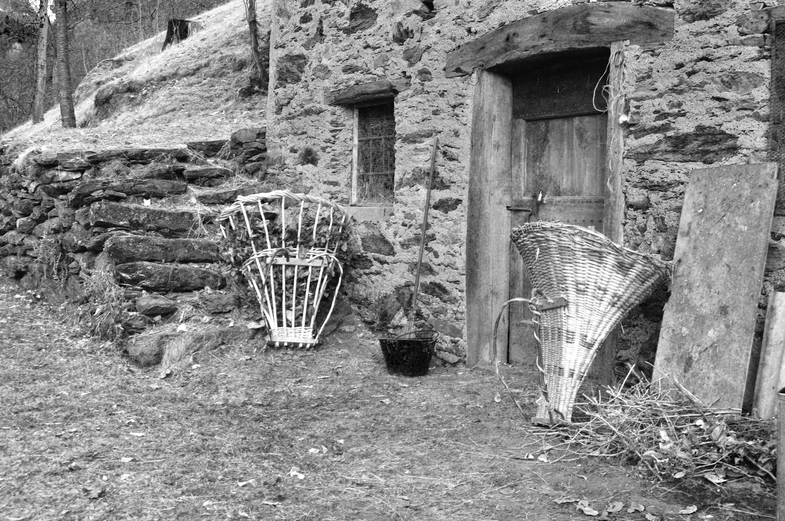 In un piccolo paese della Valtellina ci sono ancora delle persone che passano l'inverno in mezzo alle montagne lavorando nei boschi e badando agli animali. Tutti i giorni, con la loro forza, trasportano pesi con queste gerle che poi lasciano fuori dalle loro abitazioni