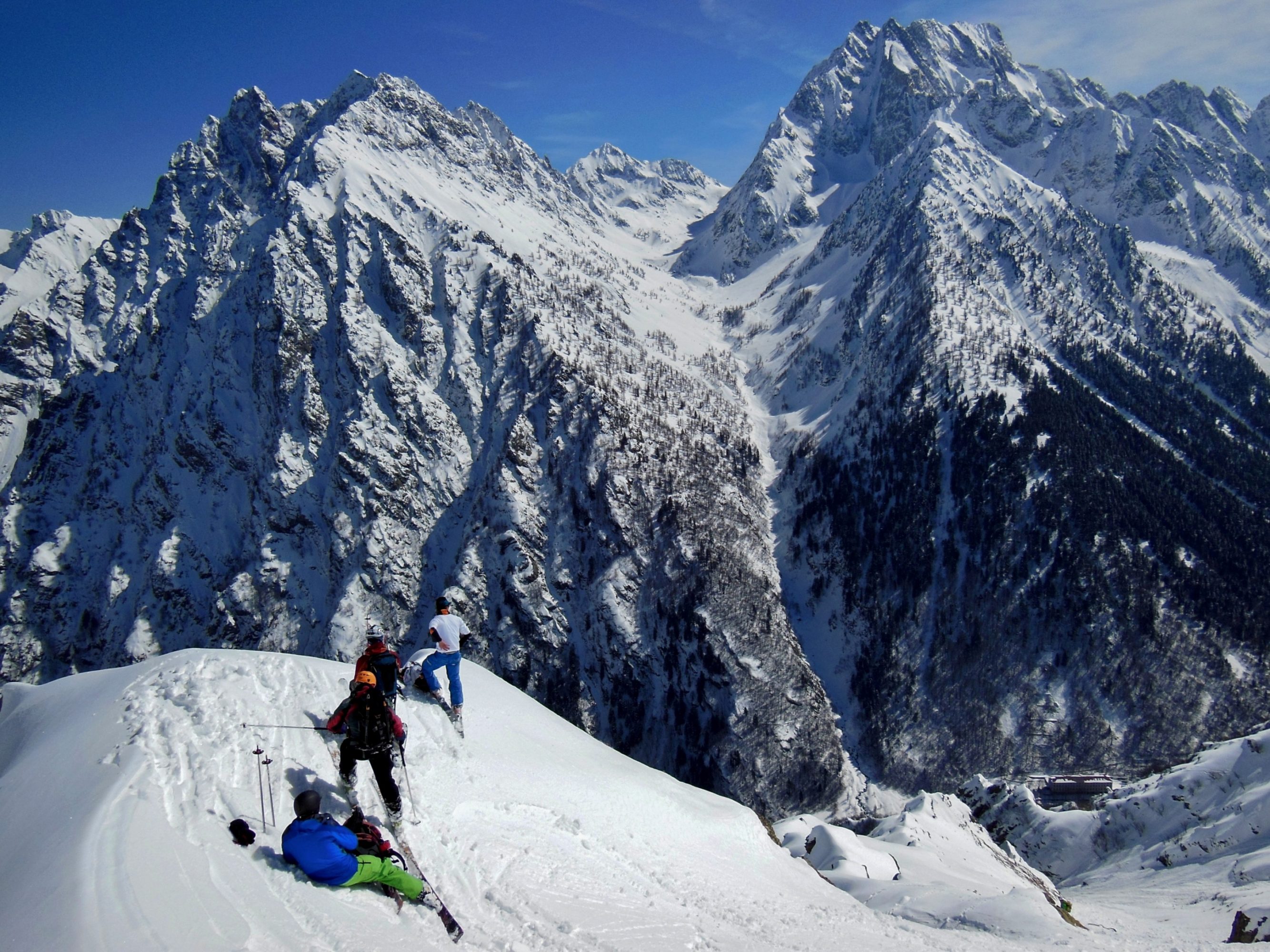 La montagna come spazio di condivisione delle proprie passioni. Alpi Marittime, Valle Gesso, durante una delle poche ripetizioni in sci della parete Sud del M.te Matto, lo sguardo degli amici è già rivolto verso nuove avventure da condividere insieme.