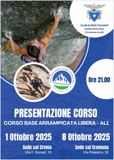 CORSO BASE di ARRAMPICATA LIBERA 7 Ottobre 2025 https://caicrema.it/wp-content/uploads/2025/10/PresentazioneCorsoAL2025.pdf. https://caicrema.it/wp-content/uploads/2025/10/PosterAL2025.pdf https://caicrema.it/wp-content/uploads/2025/10/volantinoAL2025.pdf https://caicrema.it/wp-content/uploads/2025/10/modulo-iscrizione-AL1.pdf CategoryNews