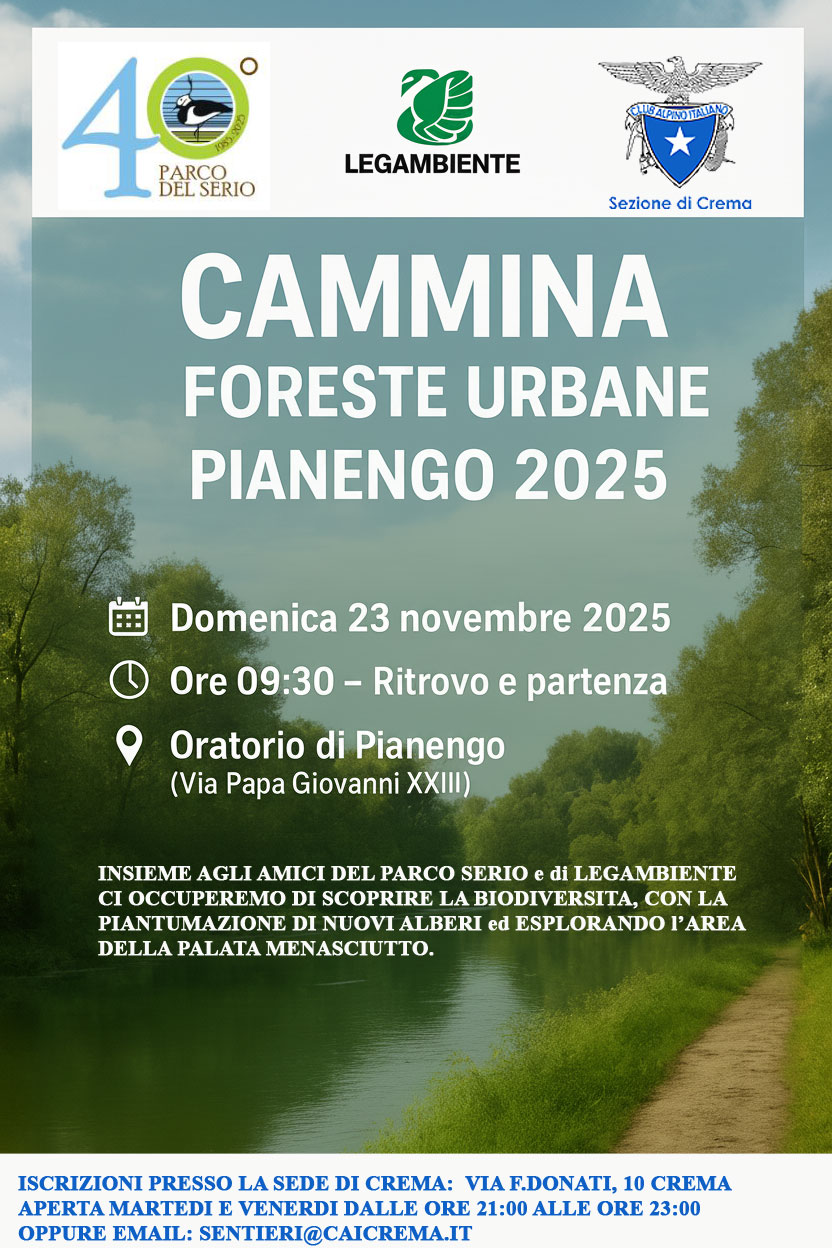 Organizzato da: Parco del Serio, Lega Ambiente e CAI Crema Data: Domenica 23 novembre 2025 Orario di inizio camminata: ore 09:30 Luogo di ritrovo e partenza: Oratorio di Pianengo (Via...