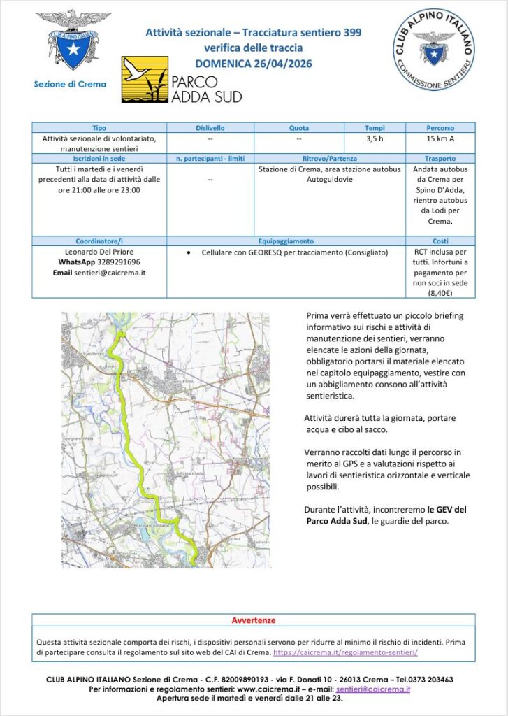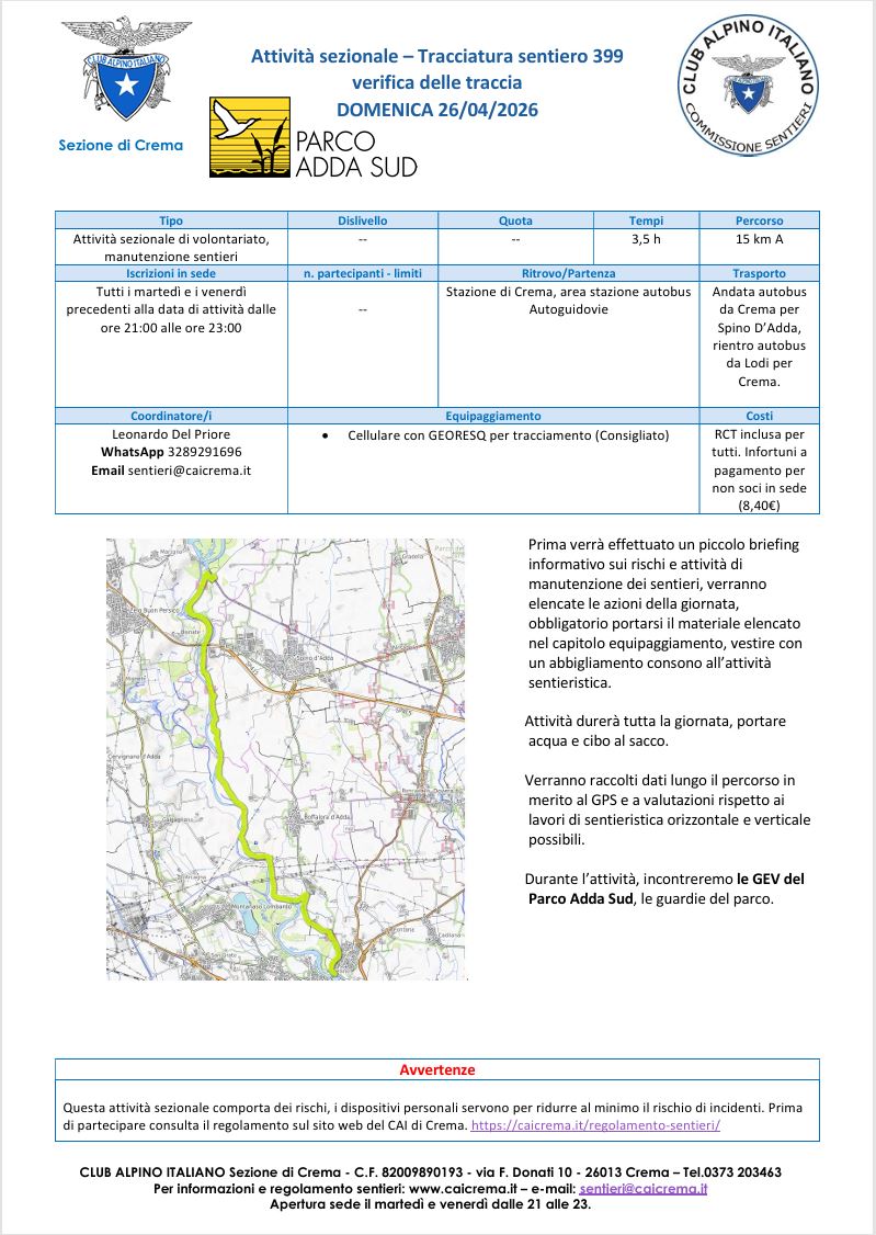 Giornata dedicata al sentiero 399 che attraversa il paesaggio naturale della sponda della provincia di Cremona del fiume Adda. Partecipa scrivi a sentieri@caicrema.it se sei un socio CAI, invia data di nascita e numero di telefono cellulare se non sei un socio CAI!