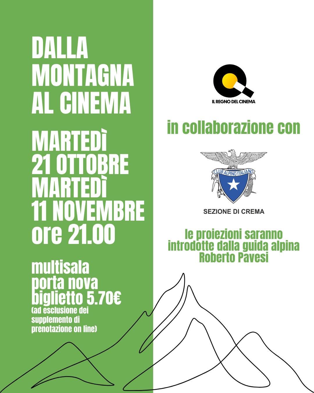 Dalla Montagna al Cinema 14 Ottobre 2025 21 OTTOBRE 2025 – Ore 21:00 11 NOVEMBRE 2025 – Ore 21:00 Multisala Porta nova Via Indipendenza, 44 Crema CategoryNews